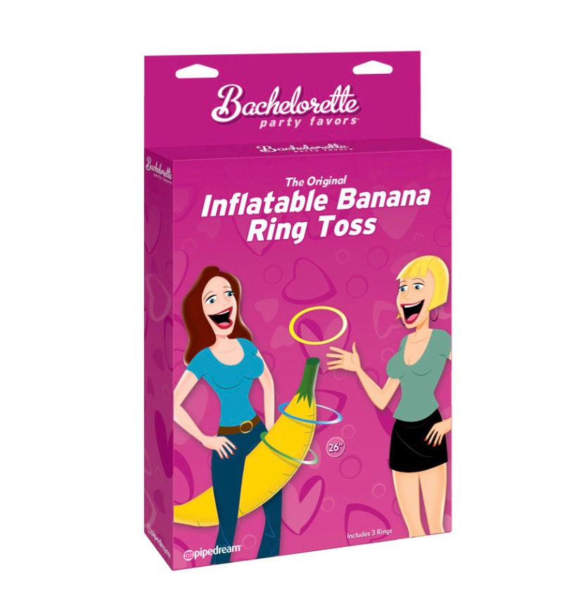 It's not a party until someone straddled The Original Inflatable Banana Ring Toss! Perfect for bachelorette parties, birthdays, or girl's night out, this blow-up bananas includes three plastic rings. Take turns trying to sink the rings around the inflatable fruit, the girl who sinks the most rings wins! It's guaranteed to make them laugh!